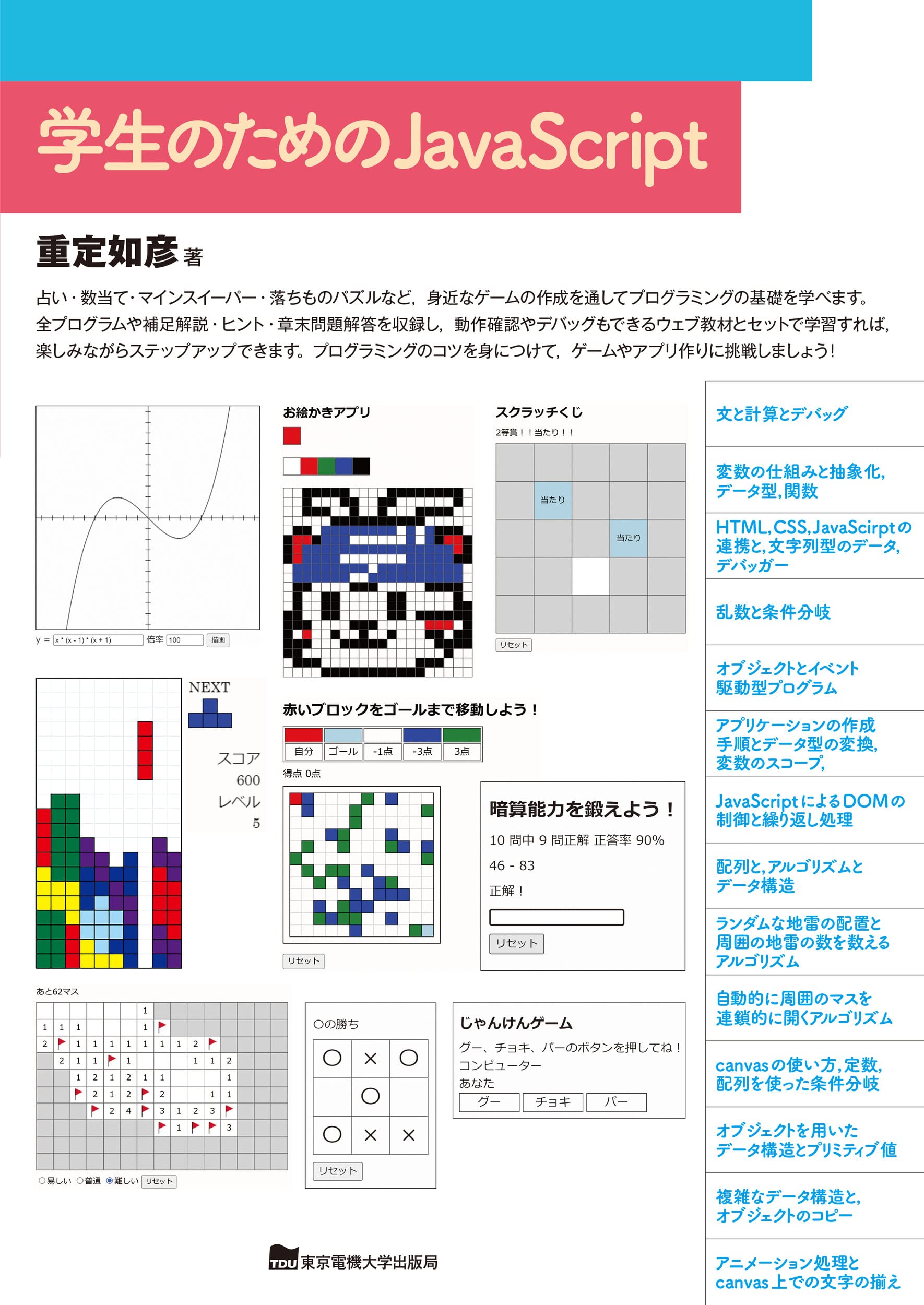 ![]() 占いや数当て、マインスイーパー、落ちものパズルなどの身近なゲーム作成を通して楽しみながらJavaScriptを学ぶ。ウェブ教材による詳細な解説も提供。 |
