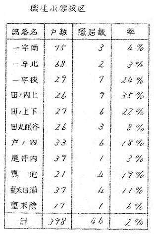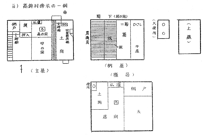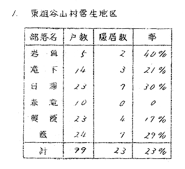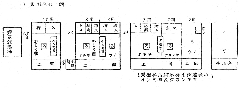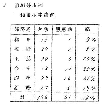 1 はしがき 隠居は法律語としては戸主が生前に家名および家産を譲渡する行為を意味するのであるから、家の制度を認めない現行民法では隠居という法律上の行為は存在しないわけであるが、生活上の事実としては全国各地に現存し、特殊な家族慣習をともなつている。 阿波においてこのような隠居の慣習の現存しているところは極めて少く、全戸数の一割以上の隠居数をもつ地域は現在まで私の調べたところでは三好郡東祖谷山村・同西祖谷山村・勝浦郡高鉾村傍示・那賀郡沢谷村の三山村と、海部郡阿部・那賀郡椿町伊島の二漁村位のものであろう。 これらの地域においても今日の社会環境から隠居の慣習を維持することが困難であるために、地域民の間には隠居のよさを認め、これを存続したい意向をもつものがあるにかゝわらず、事実としては年々減少しつゝあるのが現状である。 2 名称 阿波では戸主が生前に家名及び家産を譲渡するこの慣習をインキヨといゝ、その行為の実施を沢谷・傍示・伊島・阿部その他でも一般にインキヨするとのみいい祖谷ではヘヤヘマワルというところが多いが、他県のように、イキユズリ・オトナワタシ・ヨワタシ・オモカブワタシなどいう語はない。たゞ隠居者の居宅をインキヨと呼ぶ地域が東祖谷・沢谷・傍示の三山村・伊島の漁村をはじめ広範囲にわたつて、オモヤ・インキヨと対称的に使用されているのに対し、同意語のヘヤという語が西祖谷や阿部など、インキヨに比較してやゝ狭い地域にオモ・ヘヤと対称して使用されているにすぎない。 ところが隠居が地域的慣習として現存しないところにもインキヨ又はヘヤという呼称が行なわれ、県下一円にゆきわたつている。これは親が二三男について分れた家であり、インキヨとかヘヤという屋号の家もその多くは、隠居分家の末であるもののようである。 又前代のインキヨがまだ達者でいて孫に嫁を娶つて戸主の息子夫婦が隠居した場合古インキヨをカンキヨという。カンキヨというのは三夫婦揃わねば必要のないことだし、カンキヨという建物がなければ成立せぬのでインキヨにくらべてその数ははるかに少い。 3 分布 隠居の慣習の地域的に現存している前述の山村及び漁村について調査し得た別居隠居の数を挙げてみると次のようである(表1、表2、表3、表4、表5)。 以上の中傍示以外は別居隠居数のみを挙げたもので同居隠居はこれに劣らぬ数にのぼるものと推察される。 漁村の阿部と伊島の調査は数字が明瞭でないが、阿部では嫁のイリコミと同時に親は隠居するが隠居屋はめつたになく、ヘヤと呼ばれる隠居部屋のある家が二三割位あり、他は家長権や主婦権を息子夫婦に譲つても同一家屋に起居しているといつたものが殆んどである。伊島のインキヨも別棟・別カマドの例は極くまれで生活上の実権を子に譲つた場合にインキヨしたと称しているのが普通である。こうしたインキヨを数えるならば六割以上に及ぶであろう。 4 時期 隠居の時期は長男に嫁を娶つた機会にというのが古風であつたらしく、漁村の阿部では足入婚といつて相思の若い男女ができると仲介者が酒肴を携えて女方にゆき話をまとめる。しかる後聟が迎えに行つて嫁をつれてきてミチアケをする。嫁は一週間位聟方で泊ると実家に帰り、それからは聟が嫁の家に通うことになる。嫁は「親の苦の手伝い」というて四五年間実家にあつて親の加勢をする。約束の期間がすむか、期間内でも子ができたりするとイリコミと称して婿の家へ引移るのである。このときアラワレと称する親類及び隣近所への披露宴が張られるが、それが聟の親達の隠居の披露もかねているので、嫁の荷物はイリコミの翌日送り込まれるが、婿の親達は祝言当日別棟の隠居屋か釜屋の隣のヘヤへ荷物を運び入れる。そして嫁はイリコミと同時にヨヲワタされ主婦となつて一家の財布を握るのである。即ち阿部では隠居の時期は長男に嫁を貰つた時でなく嫁を家に迎えた際である。 これに反して長男に嫁を迎えて一定期間同居してから隠居する風が、同じ漁村の伊島や東西両祖谷をはじめ、沢谷・傍示にも存している。ただ隠居の理由の相異によつて期間にも長短の差が生じている。即ち東西両祖谷では嫁に家風を一通り教えたら隠居するのであるから、早いものは半歳、普通は二三年後である。沢谷では家風を教へ末の見込みがついてから隠居するので、嫁をもらつてから三四年後が60%を占めている。傍示では末の見据えがついた上に更に初孫の躾を一通りしてからというものが多いので、嫁をもらつてから七年から、おそいもので十年後でなければ隠居しない。さらに姑と嫁の折合が悪いために隠居をする場合は全く不定期で、沢谷や傍示では前者に比すると少数であるが、これがため二三年より十年後隠居するものがある。主屋より遠くはなれた処に耕作地を持つ沢谷では嫁をもらつてから一二年して家が落着いたら耕作上便なところへ隠居家を立てて移るものが極少数(5%)だがあ