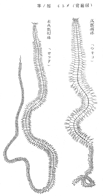 徳島生物学会 岡田克弘 まえがき 動物分類上の位置が、環形動物門、毛足綱、多毛目、ゴカイ科に属する下等動物にイトメと名付けられるムシ(蠕虫)がある。汽水域の川底の泥中で有機腐蝕物をたべて棲息する。この虫は魚釣りの餌虫として利用され徳島の方言ではサラダと呼ばれる。 イトメは毎年きまつて秋の終頃に成熟する。成熟したイトメは体の前半に雌では黄縁乃至は青緑色の卵を、雄は白色の精子を充満して肥大するが、いずれも後半は細くやせて退化する。(第1図)。そして大潮どきの夕刻満潮をすぎた頃に、生殖物を充満した体の前半だけが、退化しつゝある体の後半から切れて水中に浮いてでる。このようにして、成熟体は無数に水中で泳ぎまわりつゝ、卵又は精子を放出したのちに死んでゆく。このような現象を生物学者のあいだでは生殖群泳と呼ぶのであるが、この際に放出された卵と精子は水中で体外受精をすることによつて、あたらしい世代のイトメに発生する。本年生まれたイトメは来年の秋には同様に成熟して生殖をいとなみ、そして死んでゆく。このイトメ生殖型個体のことを徳島地方の方言では「ウキコ」と呼ぶ。全国的に通用する呼び名は、実は「バチ」又は「日本パロロ」という。 ウキコは魚釣りの餌以外には実用価値の知られていない下等動物であるためか、その生殖群泳も釣師以外の人々にはほとんど関心が持たれていない。しかし、生物学者の間では、ウキコは生物学上の世界的に有名な、そして日本特産のめずらしい動物として取扱われている。ウキコの顕著な生殖群泳は暦をめくるように毎年規則正しく起る。このことは、ウキコの群泳現象が、生物の生殖原理と月令週期性の因果関係を究明するために、最も適した研究対象となるためであろう。また、群泳に際して放出された卵と精子は下げ潮に流されつゝ体外受精がなしとげられる。即ち、海水と淡水が複雑に入りくむ環境條件のきびしい変化のもとで受精の現象が進行する。このことは、ウキコの卵と精子が、生物の受精生理を究明するために得がたい貴重な研究材料となることを意味する。 ウキコに関する從来の文献を調べて見ると、飯塚啓氏が東京帝大助教授時代に(1903年)隅田川での群泳現象の生態的観察を始めて報告した。それ以来、ウキコのことが、日本パロロという呼び名とゝもに、その生殖群泳が世界的に知られるようになつた。また、生沼曹大氏が岡山医科大学教授時代に(1926年)岡山の笹ヶ瀬川の日本パロロについて、三好普氏が水戸高等学校教授時代に(1937年)茨城縣の涸沼の日本パロロについて、さらにまた、山本時男氏(名古屋大学教授)は1947年及び1952年に、岡田要氏(東京大学教授)は1950年に、いずれも隅田川の日本パロロについて興味深い研究成果を報じている。 このように生物学の研究にきわめて貴重な日本パロロ即ちウキコが、実は当地方の吉野川下流域にはめずらしくない。板野郡の牛屋島、老門、広島地方を中心とする旧吉野川流域、或は徳島市を貫流する新町川の川すじ(助任川、田宮川、佐古川など)の川底にウキコは豊富に棲息する。したがつて、これらの流域では、年中行事のように毎年見事な生殖群泳がくりかえされる。1951年以来、筆者及び徳島生物学会の会員のなかに、新町川のウキコを材料として、その生殖群泳と受精生理に関する生物学的な研究がすゝめられ、今日すでに幾多の研究成果がみられる。こゝにその主なものを要約して紹介する。 生殖群泳についての研究業績 (1)岡田 克弘(1952)「日本パロロの生殖群泳について」 実驗生物学報 第2巻 第2号 1951年及び1952年の生殖群泳現場での生態的調査が徳島大学学芸学部生物学教室の学生諸氏によつて行なわれ、その調査資料をまとめたものがこの報告である。徳島地方での生殖群泳は、旧暦10月及び11月の新月大潮どきの数日間にわたり夕刻満潮をすぎた一定時刻に必らず大群泳がみられる。また、旧暦10月11月の満月大潮どき及び旧暦12月の新月並に満月大潮どきなどにも小規模の群泳が見られることがある。月令週期性の要因はいろいろ考えられるけれども、この調査資料では、潮汐と関連した時刻的要因、つまり「潮の高さ」が最も直接に影響していると思われる。 (2)三木 寿二(1952. '52) 「ウキコの走光性について」 徳島生物学会例会発表 この研究は徳島生物学会の例会では2回にわたり発表された。その内容は、ウキコが光に集る反応を実驗したもので、ウキコの明暗に対する適合照度と色覚の有無とを取扱つている。 (3)香川 義信(1954) 「イトメの生殖型形成過程の組織学的観察」 徳島大学学芸紀要(自然科学) 第4巻 イトメが成熟するには、その生殖型であるウキコへの変態が起る。この変態の過程を追せきした研究である。変態は生殖群泳のかなりまぎわになつておこる。変態中のイトメは棲管内で攝食を絶ち、栄養器官の退化と生殖細胞の前方体部への移動は平行する。変態完了後はホリバチ或はヤバチと呼ぶ特有の体形(第1図)にな