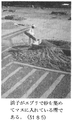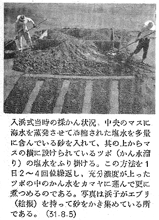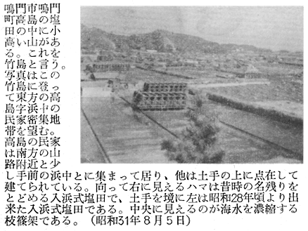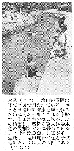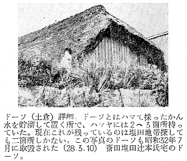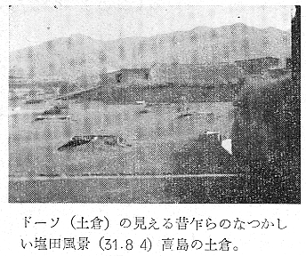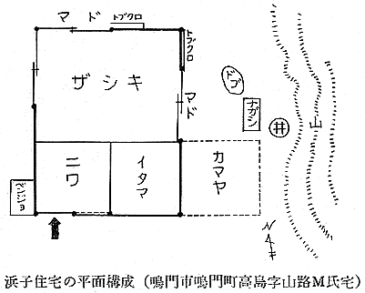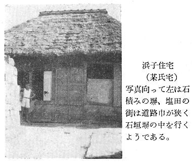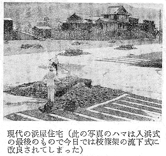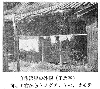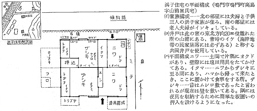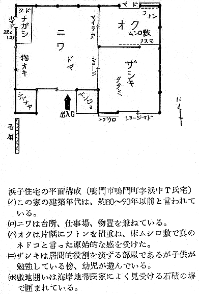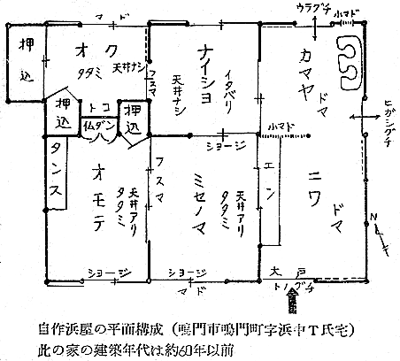 建築学会 四宮照義(徳島県西工高) 藤目正雄(徳島県西工高) 岩田公文 §1 概 説 i.1.庄屋浜屋 i 阿波の塩田地帯 i.2.自作浜屋 ii 塩田地帯の社会構造 ii 浜子住宅 iii 塩田地帯点景 §3 高島塩田地帯の住宅改善 §2 塩田民家 §4 塩田民俗建築用語集 i 浜屋住宅 §5 結 び §1,概 説 i 阿波の塩田地帯 元禄時代に兵庫県の赤穂から製塩技術を移入して阿波藩の保護の下に発達して来た塩田は、徳島県下では、鳴門市の斎田塩田、高島塩田、里浦塩田、北浜塩田と、徳島市の津田塩田の5ヶ所で、其の内斎田、高島、北浜の3塩田が昔の伝統を受継いで現在に残り、他は都市周辺への発達により次第に塩田が埋立てられて衰微しつゝある。 04minka_fig01.gif 04minka_fig02.gif 藩政時代の阿波三大産業(藍、塩、煙草)の一つとしての塩は、藍の隆盛時代に於ける「阿波大尽」と並び阿波の浜屋は、江戸は勿論全国にまでその豪盛さをうたわれたものであった。時代は下って昭和33年鳴門本斎田、高島合同との2製塩工場は合併して全国一の大製塩工場が建設され、近代設備を誇るに至った。 ii 塩田地帯の社会構造 封建時代に於ては、他の農村社会と同じく庄屋、地主、小作の階級制度が、塩田地帯では、庄屋浜屋、自作浜屋、浜子と分たれ、支配階級と被支配階級とが明瞭に区別されていたのであった。特に塩田関係に於てはその別が厳重を極めていたと言うのは、藩の財政策の一つである阿波三大産業のドル箱となっていたからである。明治以後しばしば浜屋と浜子との争いがあり、現在では浜屋連中が合同して大会社を組織して、浜子はその工場で働くようになっているが、それでも労働問題の争いが長く尾を引いている。(「塩田争議の歴史」岩村武勇氏研究) iii 塩田地帯点景 04minka_fig03.gif 04minka_fig04.gif 04minka_fig05.gif 04minka_fig06.gif 04minka_fig07.gif 04minka_fig08.gif 04minka_fig09.gif 04minka_fig10.gif 04minka_fig11.gif 04minka_fig12.gif 04minka_fig13.gif 04minka_fig14.gif 04minka_fig15.gif 04minka_fig16.gif 04minka_fig17.gif §2,塩田民家 阿波の塩田民家は、鳴門市を中心とした地帯に存在しており、実地調査の結果、概説で述べた如く浜屋住宅と浜子住宅の二つに大別し、更に浜屋住宅を庄屋浜屋と自作浜屋に小別して以下述べることにする。 i.浜屋住宅……昔からハマヤと言われる旦那衆の支配階級の民家で、これには庄屋浜屋と自作浜屋とがある。 i.1.庄屋浜屋……藩政時代塩田地帯を支配した格式ある住宅であって、高島塩田では篠原氏宅、斎田塩田では馬居氏宅と其々塩田地帯に一軒づつあった。住宅構成も農家に於ける庄屋の格式的間取、外観を有し、加へて豪商としての要素をも兼ねていたので、藍商屋敷と同じように壮大なものである。ミセ、中の間、客座敷、隔れ座敷、蔵、納戸等多くの部屋を有しているが大別して、家族用部分と接客用部分とに分たれている。(篠原、馬居両氏宅の絵図面は其々両氏宅に保存されている) 04minka_fig18.gif 04minka_fig19.gif 上の写真は鳴門市本斎田合同製塩の集会室に懸けられている額絵の一部を撮ったものであるが、昔時のハマヤの住宅及製塩建物がよく描かれている。昭和15年頃までは撫養町の町筋を一歩出ると見渡す限り塩田のハマの土手の上に点在する此のハマヤが見られたことを私は思い出し、図画の写生と言えば、すすきの波打つ土手の向うに白い煙をたなびかせているハマヤをよく描いたものであった。写真向って左の建物からハマヤ(浜屋)、塩納屋、木場、カマヤ(釜屋)、ドーソ(土倉)と呼ばれ、敷地はハマ(塩田の事)の中に埋立てられたものか、山際に山を崩して整地したものかである。 i.2.自作浜屋……一般農家の中流的な四ツ目型式の間取を有している。オモテ、オク、ミセノマ、ナイショ、カマヤ、ニワと平面構成されているのが殆んどである。自作浜屋と称するものは、以前は殆んど少なかったのであるが、藩政時代が終って明治、大正となるにつれて塩田地帯の封建的社会機構が崩れ出した頃より浜子の中から、又他所から移住して来た者達が持浜、借り浜をするようになって此所に中産階級が出現するに至ったものである。 04minka_fig20.gif 04minka_fig21.gif ii.浜子住宅……浜屋(ハヤマ)の下にあって毎日ハマに、カマヤに出て働く被支配階級の人々の住んでいた家である。これは徳島県の剣山周辺、及び吉野川流域地方の小作農家の平面構成に似て居り、所謂塩田小作住宅であって、ニワとザシキが一の字型の2間形式と、他はこれにオクを付けてT字型の3間形式との二つの様式が見られる。以下実例に就いて述べる。 04minka_fig22.gif 04minka_fig23.gif 04minka_fig24.gif 04minka_fig25.gif 04minka_fig26.gif 04minka_fig27.gif 04minka_fig28.gif 04minka_fig29.gif §3.高島塩田地帯の住宅改善 鳴門市本土から黒崎渡しに乗って約5分間渡らねばならない離れ島「高島」で生活する人々は、飲料水に大変不自由をして来たのであった。昭和26年3月この小鳴門海峡の急流を横切って海底水道管が敷設され、長い間の苦しみから解放され上水道に恵まれたのであるが水道と共にいちはやく台所改善に着眼