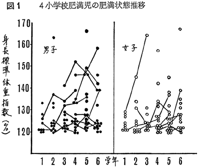 各学童の身長標準体重の120%以上を肥満とし、80%以下を栄養失調とした。肥満の程度は120〜130%(軽度)、130〜150%(中等度)、150%以上(高度)に分け、栄養失調の程度は80〜70%(軽度)、70〜60%(中等度)、60%以下(高度)に分けた。