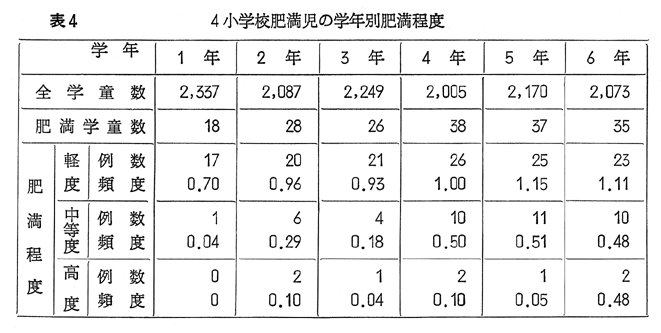 - 年度別学年別肥満児頻度の推移については各年度により多少の変動はあったが、4小学校とも一般に1・2年生より5・6年生が高頻度であった。(表3)。