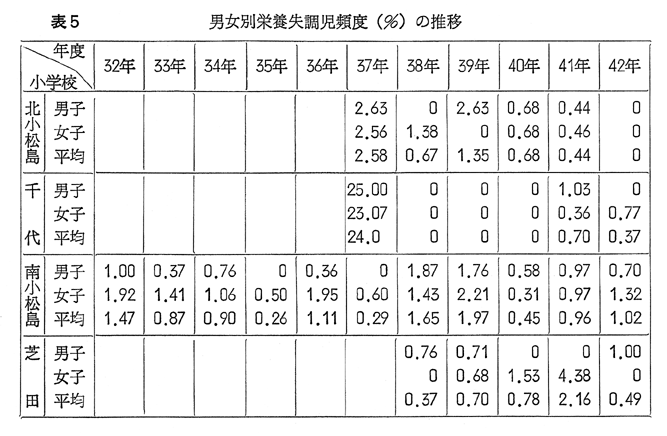 栄養失調児頻度の年度別推移については、南小松島小学校では38年、39年がやや高い頻度を示したが、11年間を通じ大体横這いの状態となっている。芝田小学校では41年に平均値2.16%の山がみられたが、その他は0.37〜0.78%の間を上下していた。北小松島小学校では37年には2.58%であったが、以後減少し42年では0となっている。千代小学校では37年に異常に高い頻度(男児25.0%女児23.0%)を示していたが、その後急激に減少し、42年では0.37%となっている。(表5)