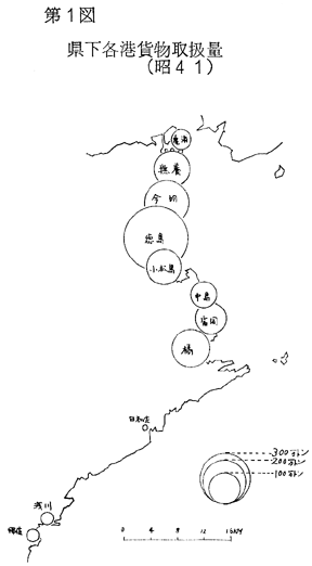 上表のように旅客輸送の点においては十分裏付けられるが貨物輸送についてはそれだけの実績はあげていないように感じられる。県下各港の貨物取扱量は第1図の通りである。