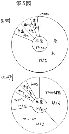 昭和41年の港湾統計によると輸入高54.8万トンに対し、輸出高0.1万トンである。普通一般に考えられる貿易港の性格を持たないことがわかる。輸入品目・地域は第3図のようになる。原木輸入が総輸入量の81.4%(44.6万トン)と極端な言い方をすれば木材輸入一辺倒といっても大きな誤りではなかろう。