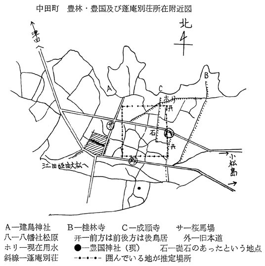 最後に豊林・豊国と関係のある蓬庵の中田別荘について記しておこう。前掲した阿淡年表秘録の中に「御隠居御屋敷二丁計隔豊国大明神建立」とある通り豊国社と別荘の間隔は2丁である。豊国の社殿敷地と思われる所から西へ2丁測れば桜の馬場であり,この線の西側に「おやぶ」・「ご隠居所」・「おもん」等いわれる地がある。この一郭が狭間という小字で蓬庵の別荘と推定した(資料参照)。そして,その地の利便さを指摘しておく。