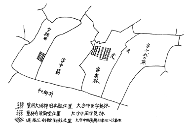同郡中田村ニ在今ハ石居ノミノコレリ別当寺杯モ跡アリ 社地九千八海石ト云石アリ此石人不知シテケガス時ハ必祟リ在ト云 大キナルアリ小サキハ甚ダ多シト云 真言九千八海ノインナリト云フ