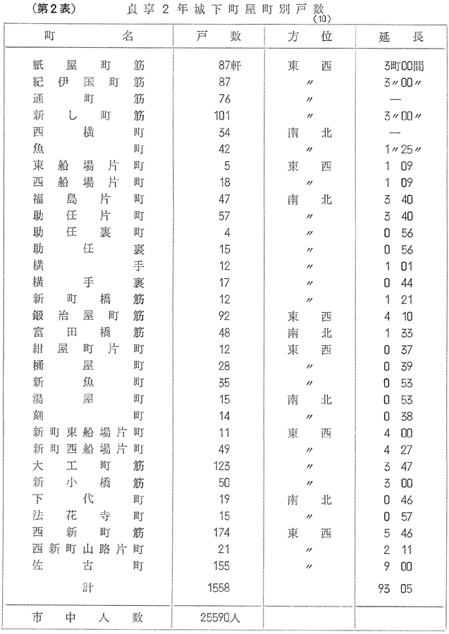 城下町において、町屋の占める社会経済的意義については、すでにIIIで述べたが、徳島藩制が確立し、その下で城下町も成立期を過ぎて、いよいよ藩政は展開期に入ろうとする貞享2年(1685)は、藩祖家政が阿波に入部したときから、ちょうど100年に当る年であるが、およそこの年における町屋は、城下町として一応の完成をみた段階と考えることは、ごく自然であろう。その規模は第2表の通りである。