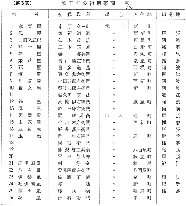 以上、一覧に示したものは、いずれも「阿波志」によって、明らかに商人であるものに限ったため、その他にもまだ初期豪商が存在していたことは当然で、可成りの欠落のあるのは残念である。この一覧表によると、その出自が、武家の系譜をひくものが13家、町人の系譜をひくものが同数の13家あるが、これらの初期豪商が、城下町の建設はもちろん、初期期徳島藩政のうえで果した役割りも、ひじょうに注目すべきものがある。まずその2〜3の例を紹介することにしよう。