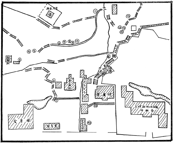 これらの建物の位置を現在の地形と対照して正確な位置づけすることも今回の調査の重要なポイントの一つであった。