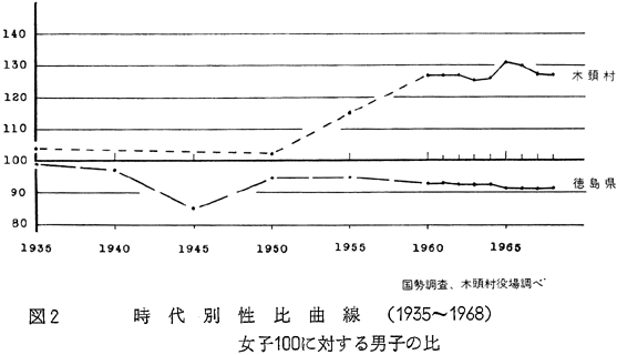 徳島県は戦前から男子よりも女子の多い地減であるが、木頭村は“男のまち”と言われる様子が、図2から明確となった。特に、昭和30年代になると男子の数が多くなり、30年代後半になると女子100に対する男子の指数は125から130に一定してきている。