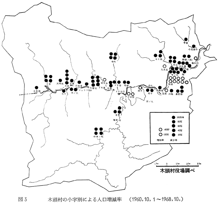 1960年から1968年のあいだに総人口は903人の減少である。この8年間における村内の人口増減地域の分布形態を考察する。図3から各部落別によって人口増減の大きい地減をあげると、まず、61〜80%も減少している地域は、冬口、寺の内、中内、宇井の内、大城、平の各部落である。また、41〜60%の減少地域は、大久保、蝉谷、黒野田、日草、下毛番、久留名の各部落である。このうち、中内、宇井の内、平、蝉谷、日草などの部落は国道から遠く交通の便が悪い地域である。また、海抜高度600m以上にあり、傾斜の急な土地を利用して部落が存立してきた。しかし、現在では、これらの地域に新しい道路が通じても、部落の人々の日常生活は自給経済から貨幣経済に変っており、部落社会における人々の生がいが薄れてきた以上、部落の崩壊はまぬがれえないのであろう。一方、人口増加のあった地域は、海川口、陰井、九文名、出原、西宇、畦ケ野、折宇谷の各部落であり、いずれも国道に沿った位置に分布している。