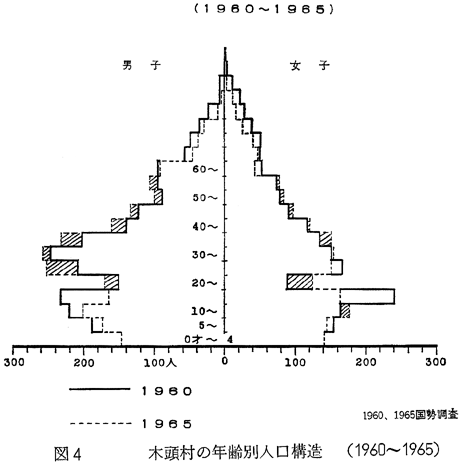 (4)、1960年から1965年のあいだでは15才〜19才の若年労働者が男女共に村外に流出している。