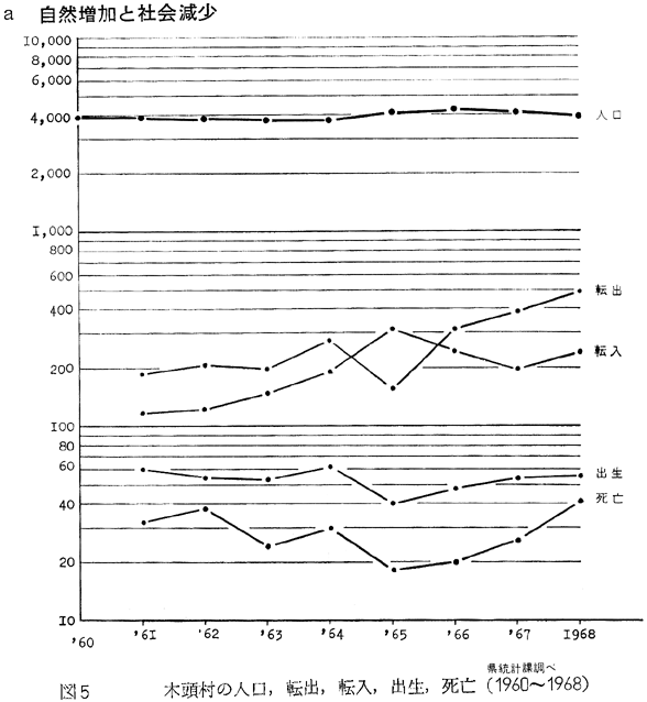 (5)、村の人口動態は自然増加と社会減少の形態を示し、自然増加が社会減少よりも多い状態が近年続いてきた。しかし、1968年には、自然増加よりも社会減少が大きくなっている。