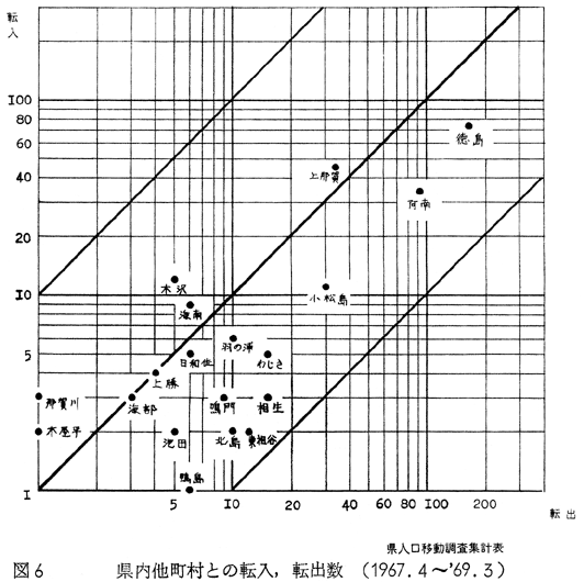 まず、県内における村の関係地減をみるために1967年4月から1969年3月までの2年間における転出、転入数を市町村別に表わしたのが図6である。これを分析すると転出超過となる地域は2つに大別される。その1つは本県の都市部にあたる徳島市、阿南市、小松島市であり、これらの地域では村内へ転入する数の約3倍の人が村外へ転出している。特に徳島市とは関係が深く人口移動率も高く、木沢村、上那賀町の山村とともに徳島市の入口移動圏の特色とされている。もう1つは相生町、鷲敷町、羽の浦町の那賀川下流域に転出超過となっている。これらの地域とは林業、木材関係の職業に従事する人々が主となって交流が続いている。次に、転入超過となる地域は上那賀町を筆頭に木沢村、海南町など村をとりまく近隣町村である。また、行政区割や交通路が変遷したとはいえ、海南町、海部町、日和佐町と交流のあることも見のがすことはできない。