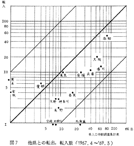 一方、県外との関係地域をみると図7に示されたとおり、ほとんどが転出超過になっている。移動量の多い地域は第1に村と県境を分ける高知県で転出、転入ともに多い。転入者は山林労務に従事する人が多く、転出者はその逆流する人と高知市に出る若年労働者も含まれる。京阪神地方との関係では高知県に次いで移動量の多い大阪府、兵庫県が中心になっている。その他、香川県、愛媛県、そして東京都ともかなりの交流を持っている様子が現われている。