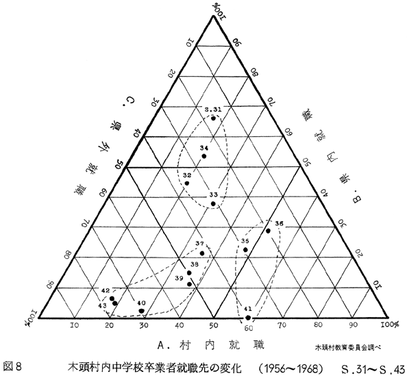 村における中卒者の高校進学率は昭和31年度では36%であり、このうちの60%までは村内の木頭分校に進学している。この傾向は昭和37年度まで続いた。昭和38年度では高校進学率は50%を占めることになり、このうちで村内の木頭分校に残る者は30%にまで減少した。昭和43年度では進学率は60%で、このうちの90%が村外の高校で学んでいる。次に、中卒者のうちで就職する者の動向をみてみたい。図8には昭和31年度から43年度までの中卒者の就職先の変化を村内、県内、県外の3地域の関係について図示した。これによって時代とともに3つのパターンに分類することができる。すなわち、(A)昭和31年度から34年度までの“村内就職中心型”(B)昭和35年度、36年度そして41年度にみられる“県外就職中心型”(C)41年年を除く、37年度から43年度までの“県内就職中心型”である。これによると、昭和35年度をさかいとして就職先の流れが、村内から村外に大きく変ったのである。昭和40年代に入って村内に残る者は皆無と言える。また、高卒者の近年の動向をみると表3のとおりで、留村者は昭和42年度で15.4%、43年度で10%となっており、そのほとんどが農業就業者である。