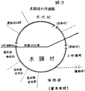 木頭村に隣接する地域は、図9のとおり同じ那賀郡の上那賀町、木沢村、海部郡海南町、三好郡東祖谷山村、高知県の香美郡物部村、安芸市、安芸郡馬路村の7市町村になる。そして、これらの地域と村との境界はすべて山の尾根からなっている。村に源を持つ那賀川の流路も深い谷を刻んで蛇行をくりかえして人を寄せつけない。このような隔絶された村で人々が他地域と、人的、物質的、文化的な交流を保つために利用した峠は重要な唯一の通路であった。最近まで利用された主な通路は、木沢村への岩倉峠、高知県への四ツ足堂峠、そして上那賀町への星越峠の3ケ所である。なお、上那賀町を南に下ると海部郡に開かれる霧越峠に至る。現在の国道175号線が車道として那賀川下流域と結ばれたのは昭和17年であり、高知県側との四ツ足堂峠トンネルが開通したのは昭和39年である。この峠道から近代的な自動車道路への変更は村の人々の生活に大きな変貌をもたらしたことは明らかである。それでは、この3本の峠道と1本の車道を通しておこなわれた婚姻によってみた村と他地域との関係を表6によって考察することにする。まず、第1に村から北に開かれた岩倉峠は助地区にあり、特に蝉谷部落とは関係が深い。この峠を越えれば隣接する木沢村に通じ、続いて三好郡、麻植郡、名西郡そして徳島市と交流を持つことになる。助地区では木沢村と通婚を持つ数が明治から今日まで上那賀町に次いで多い。現在、バスを利用すれば大変なまわり道となる。また出原地区では明治期における村外婚の場合上那賀町に次いで二番目に徳島と関係を持っていた。第2に村から西に向って高知県に通じる四ツ足堂峠を利用する場合はどうであろうか。北川地区では村外婚の場合には県内のどの地域よりも高知県との交流が多く、特に香美郡が最も関係が深い。そして、村の東端にある助地区とも明治期から今日まで高知県との通婚関係が存続してきた。第3に那賀川下流域と関係を持つためには星越峠を越えることが必要であった。村全体で那賀川を下る地域(那賀郡、阿南市)との通婚関係はやはり一番多く、特に隣接する上那賀町とは最も関係が深い。そして、この上那賀町を経由して霧越峠を越せば太平洋に開ける海部郡に通じる。物資の輸送上特に重要であった。この通路を通して通婚もおこなわれ昭和期に入っても関係が深い様子が表われている。ただ、北川地区とは通婚を持っていないことも注目される。最後に県外婚は明治、大正期を通じて高知県以外の地域とは皆無であったに等しい。わずかに、出原地区で大正期になって近畿地方と関係しているのみである。北海道との数例は以前に村から転出していった人々と血縁関係にある者との交流であろう。