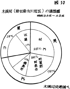 峠道から車道に変った現在では、婚姻を決定する条件も非常に変ってきているが木頭村の最近10年間(昭和34年〜43年)における通婚圏を図10によって考察する。明治期67.7%も占めていた村内婚は28%にまで減少している。これにかわって県外婚は村内婚と同じ比率を占めるまでになった。そして県外婚で関係する地域も従来の高知県から近畿地方、特にその中で大阪に中心地域が変っている。県内婚では以前から最も関係の深い上那賀町はもとより、その他の那賀郡、阿南市との交流も多くなり那賀川下流域と徳島県の都市部に通婚圏が拡大されてきている。徳島市との交流も11%を占めるに至っている。昔から関係の深い高知県との通婚は4.5%、海部郡とは3.9%で少数ながら存続している様子がうかがわれる。