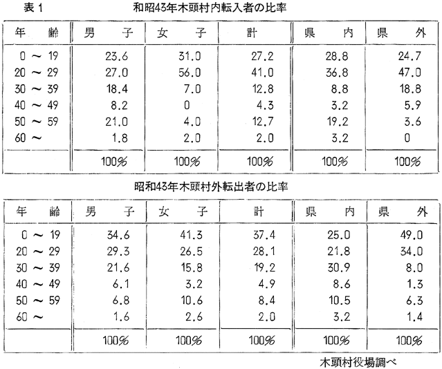 移動する人口を年齢別によって考察すると表1のとおり、15〜64才の生産年齢入口が移動の中心となるのは一般的で、その多くは職業移動と結びついている。そして、15才未満と65才以上の従属人口の移動はあまり大きくならないのが普通である。ここではこの昭和43年の統計を指標にして村の特性をみる。まず、転入者では男女共に20代が圧倒的に多い。特に、女子の場合では90%近くまでが29才以下の年齢層である。そして、男子では50代が多いことも注目される。これは県内との移動の中においても50代の年齢層が多いのと関連して、近隣町村からの山林労働者の流入によるところが多大である。県外からの転入の場合には39才までの年齢層で90%を占めている。−方、村外への転出者についてみると、男女共に20才未満の者が最も多く、明らかに学卒者の村外流出に結びついている。2番目に多いのは20代、そして3番目が30代となり、この10〜30代までで大部分を占める。また村外への転出地域を県内、県外に区別してみると、県外へ流出するのは29才までの若年労働者で80%を占める。しかし、県内へ流出する人口では10代から50代までの各年代に大きな差がなく、この中で30代の年齢層が30%を示して最も多いことは注目される。