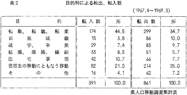県人口移動調査表の理由別移動状況によって転出入の目的に分類すると表2の結果になる。一般的に移動の主たる要因は職業に関係したものであるが本村でも、転勤、転職、転業等による理由が転出入の第一の要因となっている。そして、“世帯主の移動にともなう移動”も職業移動に関係するものと考えるとその比率は全体の60%を占める。次に、移動の割合ではかならずしも多くはないが重要な学卒者の動向と今回調査することのできた縁組による移動について述べることにする。