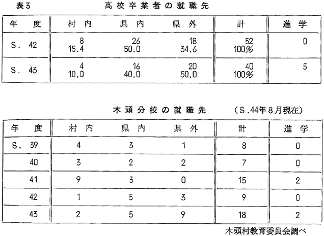 ここで村内の県立那賀高校木頭分校の生徒の進路について、この調査のおこなわれた昭和44年8月現在の時点で考察することにする。表3のとおり、昭和39年度から41年度の卒業生では村内に残った者が多くなっている。この人々の多くは村内で第一次産業以外の職場が得られたからである。また、村外に職場を求めた者も数年後にはかならず村に帰って来る前提のもとに出て行き、そして、すでに帰村した者も含まれている。そこで、いま少し、村外に職場を求めた中卒者の大多数と高卒者では90%の人々の一般的な傾向について考えてみたい。1965年の統計によると村で農業に従事していても専業農家は一戸もない。