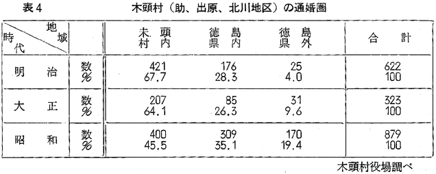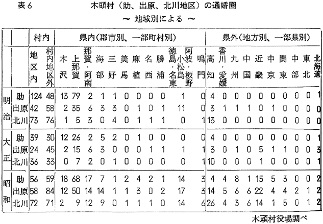 表4から今日の行政区割によって考察すると、村内婚は、明治期67.7%、大正期64.1%となっている。この通婚圏の狭さは、やはり那賀川の最上流地域で周囲を山にかこまれ他地域と人的、物質的、文化的交流の少ない閉鎖的な社会を物語っていよう。しかし、昭和期に入ると村内婚は50%を割って、県外との通婚も20%近くになり、県内との通婚が35%になっている。次に、表5に示したごとく、各地区に分けて分析したい。また、漁村であり、陸の孤島と言われた海部郡由岐町の阿部、伊座利地区の通婚圏とも比較する。まず、明治期における助地区では地区内の婚姻が45.3%を占めて1番閉鎖的な数値を示している。しかし、村の3地区とも阿部(61.4%)伊座利(85.5%)地区ほどの閉鎖性を持っていなかった。出原地区は特に地区内の婚姻(28.4%)が少なく、他地域との交流が昔から多い地域であることが理解できる。大正期に入っても3地区ともに大きな変貌はなく、ゆっくりした速度でもって通婚圏が拡大されていった様子が表われている。そのうちで、出原地区において明治期の終りから大正期にかけて県外との交流が現われ始めている。北川地区で県外との通婚の比率がやや高いのは隣接する高知県との交流が大部分を占めている。昭和期では、助、出原、北川の3地区ともに、各地区内での通婚が減少して、一方で県外との通婚の比率が増加してきた。そして、県内との通婚の比率は明治、大正 昭和を通じて大きな変化はない。阿部、伊座利地区では昭和期に入ると、比率では県外との通婚が急激に多くなっている。そして県内との通婚が木頭村と比べて少ない。同じ僻地性を持つ地域でも、内陸地域と沿岸地域とでは色々な要因によって地域差が現われるのであろう。
