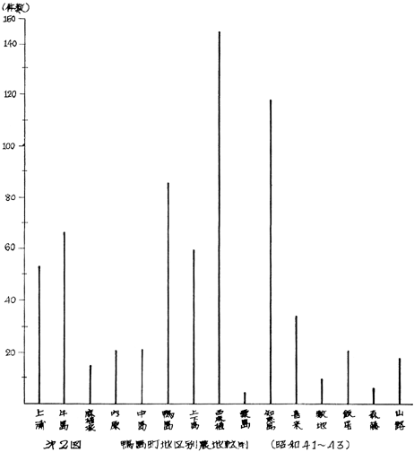 次に転用件数の多い西麻植、知恵島、鴨島、牛島、上下島、上浦の6地区の転用状況を見てみると、第3図の如くである。これらの地区はすべて国道192号線か318号線が通っている地域にあたり、やはり道路沿線の発展状況を示している。その中でも、特に中心(町心)鴨島は、商店の増加が著るしく、又アパート貸家等も比較的多い。そして地形的にも高燥で畑地からの転用が多くなっている。