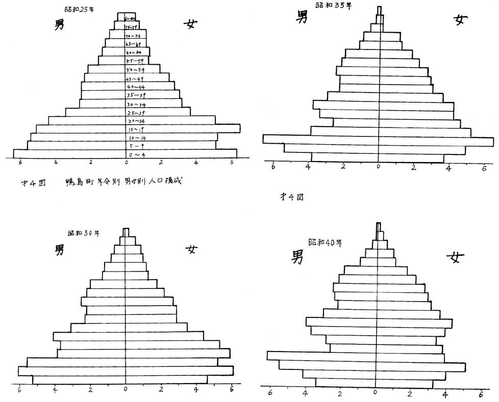 次に年令別、男女別人口構成からみると、第○図のような変遷を示しているが、昭和40年の図からみて、鴨島町は、農村型(老人と子供が多く、生産年令人口が少ない。女子が多い)に属することを示している。しかし、その中で30〜40才代の年令層が、いくぶんのふくらみを示すが、これは、鴨島町の今後の発展を示すあらわれで、徳島の Hinterland である鴨島が、国道192号線沿いに finger 状の Urban fringe がしのびよっているあらわれであろう。しかし全般として、阪神へ生産年令人口を供給している地域であることに変わりはない。