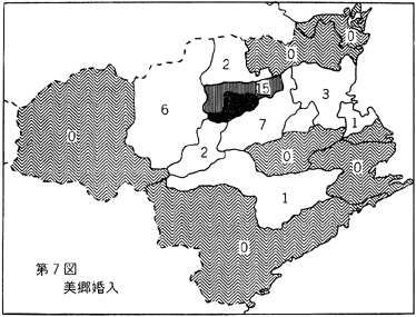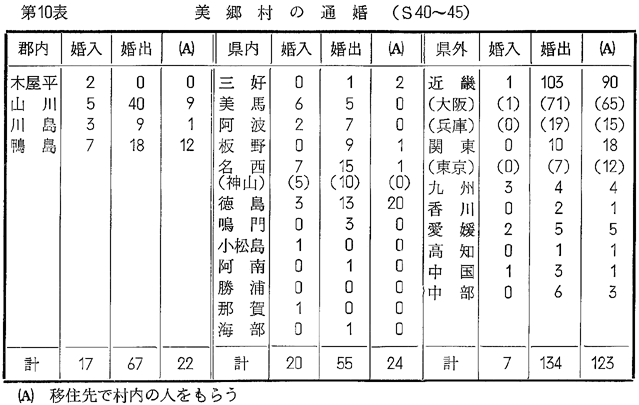 最後に、人口の生産的要素を、労働力人口と、非労動力人口、15才未満の人口の割合からみてみると、第7表の如くである。 通婚より鴨島町の傾向をみてみると、やはり吉野川平野を中心に、その周辺の町村との関係が強く出ている。第6図で見る如く、徳島市、名西郡、麻植郡、板野郡との関係が強く、この四市郡で、婚出では、県内全体の73.1%、婚入では69.3%を占めている。そして婚入は上流各地よりが多く、婚出は下流の徳島市へ向いて多く流れているという一般的傾向がみられる。又山村美郷と比較してみると、第8、9表の如くであり、美郷の場合、婚入よりも、一方的に村外婚出の方が多くなっており、このことは、人口の向都離村に伴なうものであり、村を離れた青年が、結婚適令期に達し、再び村の女性を都市ヘ呼び寄せる為である。婚入が少なく、婚出が多いのは、男子が先に就職等で転出し、あとから村内の女子を呼び寄せているからである。即ち、村外へ出て、村内の人と結婚(村外における村内婚)しているのである。この傾向は、鴨島町の県外婚出にもあらわれている。