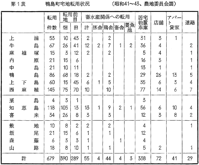 上浦、牛島、上下島地区は、国道沿いではあるが、水田からの転用件数が多く、低湿であるため特に国道沿いにかたよっている傾向がある。その中で、牛島地区は、北の自然堤防沿いをも多く含み、そのため、鶏舎などの農畜産関係の転用も比較的多く含まれているのである。最後に、自然堤防上の知恵島地区では、前述した通り、畜舎、鶏舎等の多いのが目立つ。又最近は、各種工場の進出も目立ち、第2表に示す如く、300坪以上の面積転用のうち、約50%を工場が占めている。