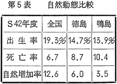 人口の動態面よりさぐってみると、第5表の如くである。即ち昭和42年度における自然動態の出生率を、全国、徳島県に比較すれば、全国19.3パーミリ、徳島県14.7パーミリに対し、鴨島町は更に低く、13.9パーミリである。一方死亡率を見ると、全国6.7パーミリ、徳島県8.7パーミリに対し、鴨島町は10.4パーミリと高くなっている。これを総合した自然増加率で見ると、全国12.6パーミリに対し、徳島県は6.0パーミリと低く、更に鴨島町は3.5パーミリと一層低く、大きく差が出てくる。このことは、再生産年令層が少なく、高年令層の多いことを示していると解される。これは、次の社会動態とも大きく関連しており、第6表の如く、転出のうち、阪神へ出ていく数の多いことからもうかがえるのである。即ち、昭和42年度の転出超過は379人であるが、県外移動だけを取り出すと、473人の転出超過となり、その不足分94人を県内他町村からの転入で補っているのである。しかし、こういう2重構造があるとはいえ、昭和44年度に348人の転入超過を示したということは、国道192号線沿いに、徳島市の Urban fringe が finger 状に Sprawl してきているあらわれであると言えよう。