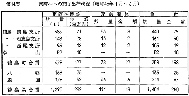 次に野菜の出荷状況より、徳島との関係をみてみると、第13表の如く、キャベツ、白菜などは、徳島市場へ多く出荷されているが、胡瓜、茄子、里芋などは圧倒的に阪神への出荷量が多くなっており、この点では、阪神の輸送園芸(Truck farming)地域である。