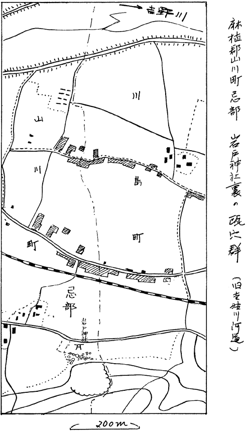 現地は吉野川が川島城跡、岩の鼻をさけて大きく迂廻するその岩の鼻を、出張頂点として形する麻植郡中央部丘陵地帯の東方に面する洪積層地帯であって国道西条線と県道森山線が接続する地点より東へ約1m、県道から150mばかり南方で、一般に深田と言われている一毛田の低湿を前にした約3aの畑である。