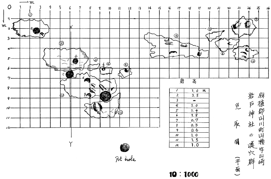 8月3日は川島駅8時集合して上桜城の実測を行なって実測図を作製したその後、二ツ森神社の調査、山川町の岩戸神社の旧吉野川河道にあたる岩戸神社裏の甌穴群を調査した。