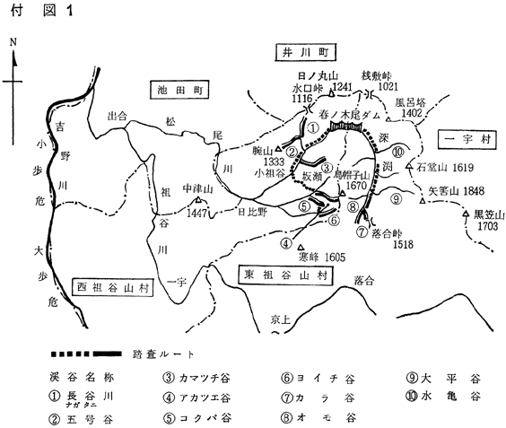 昭和46年7月21日よりの5日間、上図踏査ルート(図1)のように、河川渓谷に沿った調査を行った。