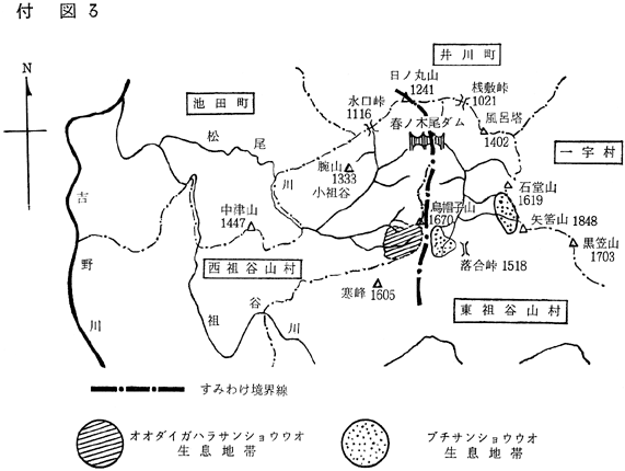 この度の調査結果からその分布状況を考察すると、烏帽子山、春ノ木尾ダム日ノ丸山(1,240m)を通る南北稜線を境として、西側渓谷にはオオダイガハラサンショウウオのみが生息し、東側渓谷ではブチサンショウウオのみが生息する事実から、この線を境界線としてすみわけ現象がみられるようである。