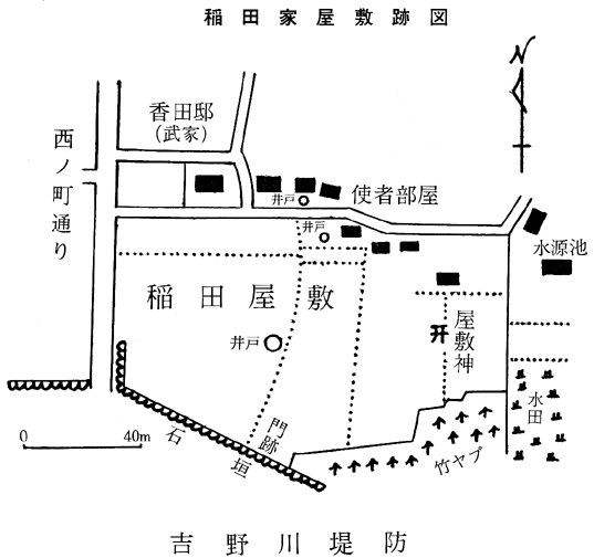 天正13年脇城に入城した稲田植元(たねもと)(宗心(そうしん))は、打続く戦乱のために荒廃した城下町の復興に意を注ぎ、家臣、年寄に計って、かかり事一切御免としたため付近の住民は続々と集り、城下町が阿北第一の繁盛街となり、現代脇町の基礎が置かれたのである。かくして脇城下は四国、中国地方の商人まで移住し来って、当時としては珍しい一種の商業都市として繁栄し、今も主要街路となっている本町、大工町、北町、突抜町、南町、中町等の町並もこの時の都市計画によって構成されたものである。