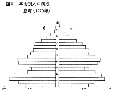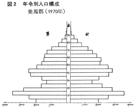 脇町の人口は現在19,096人で県下の2.4%を占め、人口密度は173人となっている。図1により年次別変化を見ると戦後のベビー・ブームを頂点に男女とも急激に減少傾向を見せており、昭和45年以降、戦前以下となっている。一方世帯数は人口の滅少にもかかわらず、維持ないし漸次増加の傾向を見せて除々にではあるが核家族化を示している。昭和30年を100とした場合、昭和45年の人口伸率は80.0、一方世帯数伸率は101.8がこれを裏付けており、今後もこの傾向は進行するものと考えられる。人口の減少を分析して見ると、図2で明らかなように、同じ減少を示す美馬郡全体と比較すると脇町の場合はそれほどでもないが生産年令人口(15〜64才)が大量に流出する典型的な農村型を示している。しかし、これも昭和35年の73.1、同40年の61.9、同45年の53.5と生産年令人口比が次第に若返りの数字を示していることは注目されよう。だが20〜40才の滅少は児童、生徒数の滅少にも反映し、今後人口減少が続くことを示している。社会移動では昭和43年を契機に転出が減少し、昭和45年には42年の5分の1以下の減少率となっている。