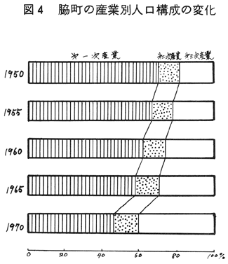 脇町においては、昭和44年工場誘致が行なわれて以来、人口減少率が横ばいいとなり、若年労働者が女子を中心として定着している。また産業別人口構成では、第3次産業が大幅に増加している。