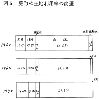 図5の土地利用率では、1960年以来、水田が増加して畑地が減少しつつあり、また二毛田が激減して一毛田が多くなっている。