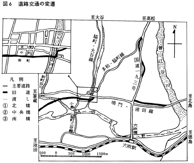 大正2年、現在の穴吹橋北詰―天王下―脇町線が脇町街道として改修されており、穴吹駅と脇町が結ばれることになった。これに拍車をかけるように昭和3年には穴吹橋が完成し、脇町ではこの前年中央橋が架設され(明治19年ごろから存在し、北橋と呼ばれていた)、さらに南橋が昭和8年、北橋も昭和29年には架設された。大正8年以降、自動車の発達により交通機関の革命がもたらされ、それに並行して商店は漸次街道沿線に集まり、南町は商業の中心地から離れてゆく。その後、県道鳴門―池田線(昭和29年)、多和―脇町線(同)が完成し、国道徳島―高松線も昭和32年舗装された。現在脇町は道路網が再整備されつつあり、特に江原地区、岩倉地区ではバイパス建設の進行、対岸では新しい穴吹橋架橋問題が調査段階に入るなど中心部と周辺部を結ぶ交通機関や道路の発達は地域住民の生活様式や社会意識の面での近代化をも引きおこすこととなり(2