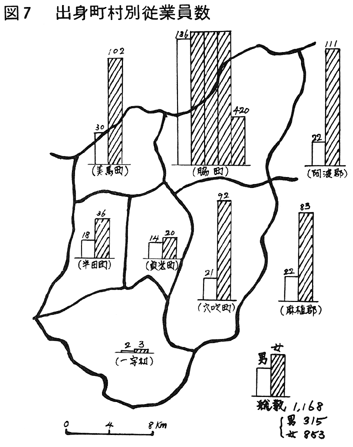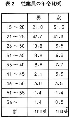 の従業員数を出身町村別に表わしたものであるが、全従業員の約50%にあたる556人が脇町の出身である。過疎化のすすむ美馬郡各町村にあって、脇町は昭和44年これら三大企業の誘致以来、人口滅少を持ち直しつつある。これは脇町が過疎町村としての指定をまぬがれ、「人口を減さない行政」をモットーに地場産業を含めた職場の開拓に力を入れた成果であろう。また隣接の阿波、美馬、穴吹、山川の各町からの通勤者も多く、全体の41%を占めている。それに比して貞光町、半田町は併せても10%未満にとどまっている。次に男女比を考えて見た時、従業員の80%近くが女子であることも注目されよう。これは企業の業種形態の多くが女子の繊細な手先を必要とするものであり、必然の結果である。表2では30才未満の従業員が全体の70%強となっており、しかも21〜25才の年令層が男女共全体の40%を占めている。このことは若干労働者の職場に不足する県西部にあって企業の発展と共に地元脇町にとっても活気を与えている。企業の誘致は公害等の関連もあって難しい情勢にあり、一概に言えないが、江原地区の清水にも仏壇工場が進出し、操業を間近にひかえて労働力を吸収するなど、脇町の場合これらの企業は生活圏から見た時、大きな勢力を持っているということができよう。