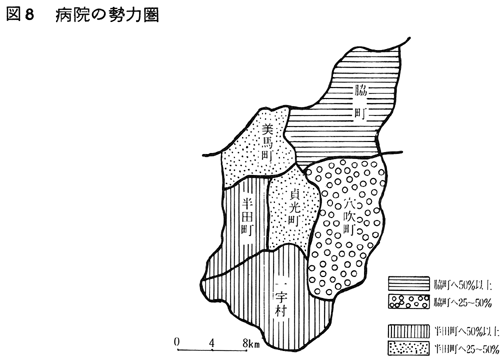 さらに病院の利用によって生活圏を見てみた。「あなたの家では入院するぐらいの重い病気の時、主にどこの病院に行きますか」という設問に対して、図8のような結果となった。すなわち、脇町では68%の家庭が地元の病院(医院)を利用している。脇町には病院数も美馬郡の他町村に比べて多く、その診療内容も多岐にわたっている等が穴吹町の40%近くを勢力圏としている理由でもあろう。なお、ここで注目すべき点は総合病院を持つ半田町が郡西部に強い勢力を持っていることである。進んだ医療器械、診療科目の多い総合病院の優位性があらわれている。地元半田町の92%は別としても、辺地一宇村の50%、比較的病院の多い貞光町でさえ25%の利用率となっている。また美馬町も青石潜水橋やさらに完成によって半田町との往来が容易になったことと相まって約40%の家庭が半田町の病院を利用している。したがって郡内においては病院・医院の多い脇町と総合病院をもつ半田町が二大生活圏を形成しており、脇町民にとっては地元、次いで徳島市内の病院を利用していることが明らかとなっている。
