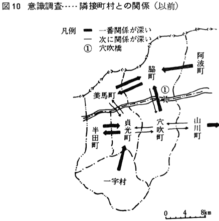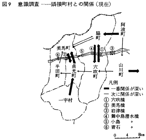 この調査は意識的に現在はどの町村と最も関係が深いか、また以前にはどの町村との関係が深かったかをアンケート調査したものである。図9、10の両図を比較してみると、橋のなかった頃の吉野川南岸の住民と北岸の住民との関係はそれほどでなく、吉野川を挾んで交通が遮断されていたため関係が余りなかったと意識している者が多く、いわば川の流れに並行した結びつきを意識している。吉野川南岸においては半田町と貞光町とは非常に近い距離であること、一宇村と貞光町では貞光町を経ずして鉄道沿線に出られないという点から今も昔も深い関係がある。現在美馬橋をはじめ、数多くの潜水橋ができ、南岸と北岸の往来が容易になった。その点で変化の顕著なのは美馬町である。以前と比べて脇町との関係が非常に弱くなり、脇町の生活圏から離れつつある。しかし阿波町は現在も結びつきを強く意識している。