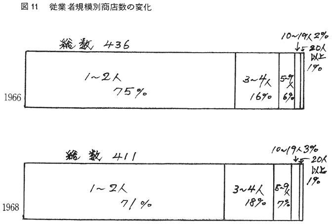 )したがって後背地人口2万人程度の脇町なら小売商店数は280ぐらいが妥当といえる。脇町の場合、中心商店街だけで1970年で法人53、個人416、計469の商店数を有しており、定住人口で1万人程度不足している。すなわち隣接町村に対する勢力圏が問題となってこよう。これを一店当りの世帯数で見ると全国平均は15世帯で本県の場合、石井町が平均規模に該当しているが、一店当りの売上高では劣っている。美馬郡内では貞光町が、一店当りの世帯数では劣るものの専業度で脇町を大きく上回り、後に述べるように脇町商店街に対する商圏を形成している。脇町では売場面積は1966年の10,626平方メートルから1968年には14,909平方メートルと拡張されてはいるものの、従業者規模別でみると(図11)、従業員1〜2人の商店が7割以上を占め、90%までが4人以下の小規模経営である。
