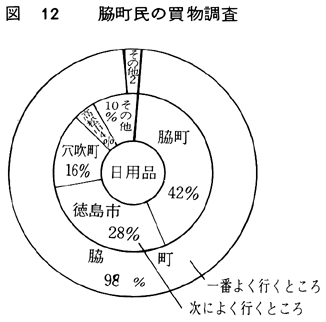 高級品になると徳島市が大きなウェートを占めてくる。次によく行く所では徳島市が50%を占め、高級品は市部の占める度合が強く出ている。1つの商店街を1つの売場として考えた場合、商店街の売上げに影響を与える競争関係は一般的には、他の商店街とするもの60.8%、つぎに百貨店とするもの19.4%、小売市場12.3%、生協の9.1、スーパー・マーケット5.4%の順となっている。しかし、徳島市のような百貨店を持つ商店街と脇町などではこの数字も大きく異ってこよう。百貨店にやってきた消費者はその3分の2までが、その地域商店街の消費者ともなっており(大分市の例(4