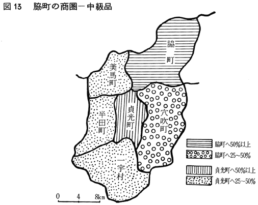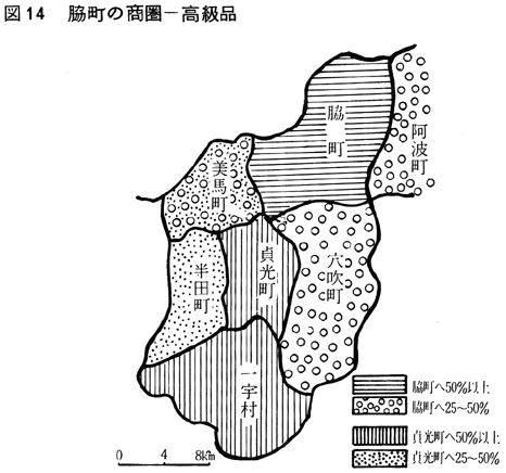 次に隣接町村の脇町商店街に対する商圏調査を行った。一般的に購入率70%以上の絶対圏は品物にもよるが商店街より0.5〜1.0km(徒歩で7〜15分)の距離である。また70%〜50%の中間圏は1.5〜2.0km(20〜30分)までの範囲であり、それ以遠は30%か、少なくても20%ぐらいの急減ぶりを示し、商圏の外縁部(外圏)を形成している。ここでは最寄品は省略して、中級品と高級品のみ商圏を表わしてみたが、中級品については穴吹町が29%を示し脇町の外縁部となっている。一方貞光町が半田町(44%)、一宇村(38%)、美馬町(32%)を商圏としているのがわかる。高級品については貞光町は中級品と同じ傾向を示しているが、脇町は穴吹町、阿波町、美馬町を外縁部としている。従って美馬町は脇町、貞光両町の競合地域となっていることがわかる。