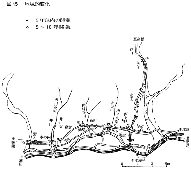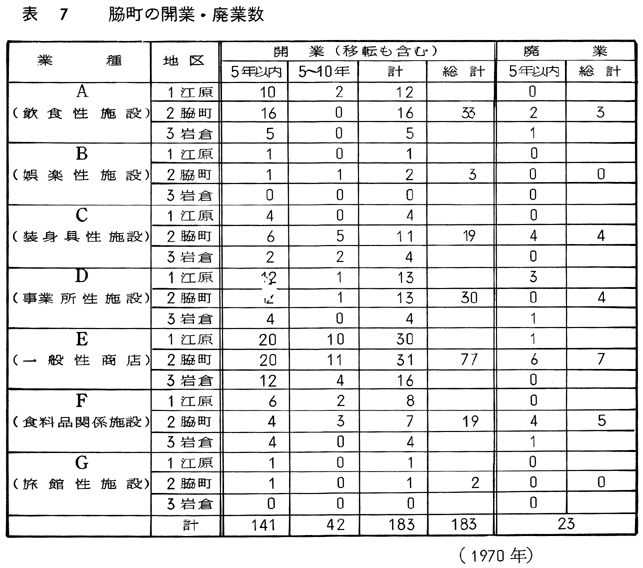 脇町においては道路網の整備、市部の顧客動員力の増大などにより、商店街の機能も変化しつつあるが、特にここでは商店の地域的な動態を把えてみた。表7に見られるように過去5〜10年間に開業した商店は42店にすぎないが5年以内の開業は141店にのぼっており、ここ数年で商店数が急増したことを示している。これを業種別に七種類に分類してみると、一般性商店が最も多く、次いで飲食性、事業所性施設が多くなっており、特に石油、自動車関係のものが目立つ一方、娯楽性、旅館性施設も少数であるが現われている。これらの商店、事業所の分布状況は江原地区、脇町地区に多いが、特に国道192号線(穴吹―高松線)では、穴吹橋北詰―拝原間、鳴門―池田線では曾江谷橋―拝原間のバイパス沿線や脇町商店街さらに岩倉のバイパスの沿線に増えつつある。しかし現地で調査した結果、純粋の開業は意外に少なく、全体の24.6%にすぎない。その理由は岩倉地区のほぼ全域、江原地区の拝原、北原、曾江、落合などでバイパス完成により、旧道となった商店が新道に進出したにすぎない店が多いからである。