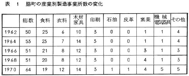 主要作物では、米作が主力で麦類が後退という一般的パターンを示している。一方、樹園地は増加傾向にあり、これはブドウ、うめなどの増加によるが、ミカンは横ばい、カキは大幅に減少している。さらに一部宅地化、道路化が進み、総利用面積も1960年以来377ha減少している。農業以外では、特に有望な産業も見られないが、表1.によると、それまで総数で50余であった製造事業所数が昭和45年度には64に増加している。この中には皮革、ネジ、電気器具を扱う誘致三大工場も含まれており、それぞれ大きな労働力を吸収しているのに対して、脇町に存在するかつての有力製糸会社が本年3月末まで閉鎖されたが、脇町が養蚕の町として栄えた象徴であっただけに今昔の感がある。